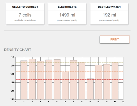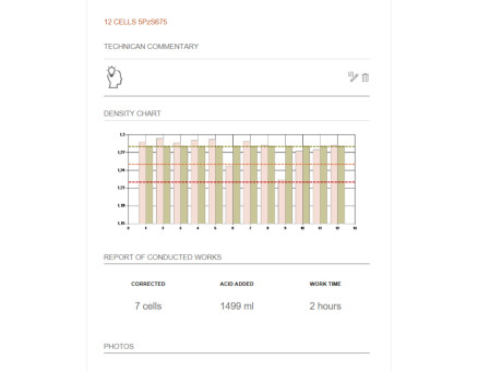 Using manual solutions wastes valuable time with lengthy measurements and note-taking of results. The solution of the Electrolyte Regulation System is a fast electronic measurement, automatic storage of results in memory and their automatic transfer to the computer software. The software automatically performs all the necessary calculations and informs you of any necessary corrections to the density of individual cells. You can use any electrolyte for adjustment, the programme will automatically adjust to the density of the mixture you use in your business.