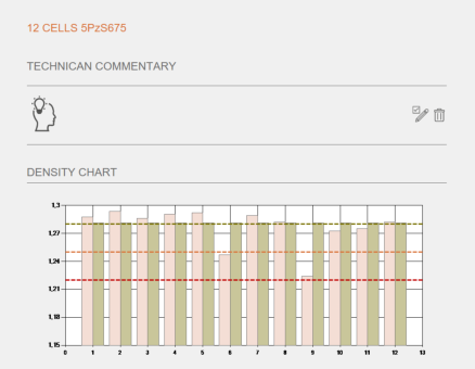 Cells that have a lower electrolyte density than others will be damaged first. Setting the same density in all cells results in even degradation of the battery. The correct electrolyte density in all cells also ensures that the maximum cell capacity available is used.